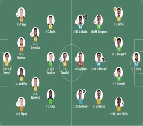 阿森納(433):1-拉亞;4-懷特(83’89-薩爾蒙),16-諾爾高,5-因卡皮耶(63’33-卡拉菲奧里),45-斯凱利;8-厄德高(71’22-恩瓦內(nèi)里),36-蘇維門迪,23-梅里諾;25-馬杜埃凱(71’7-薩卡),14-哲凱賴什(62’9-熱蘇斯),11-馬丁內(nèi)利